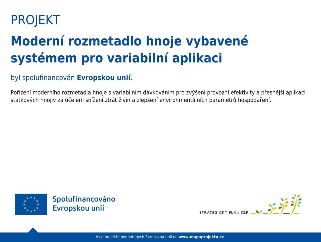 V roce 2025 jsme uspěli se žádostí o dotaci na pořízení moderního rozmetadla hnoje vybaveného systémem pro variabilní aplikaci v rámci Strategického plánu SZP na období 2023-2027.